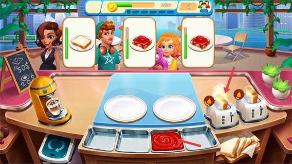 3、隨著訂單增多需要同時處理多個訂單,使用烤面包機烤制面包,再為不同訂單的面包涂抹相應醬料,高效完成烹飪任務。
