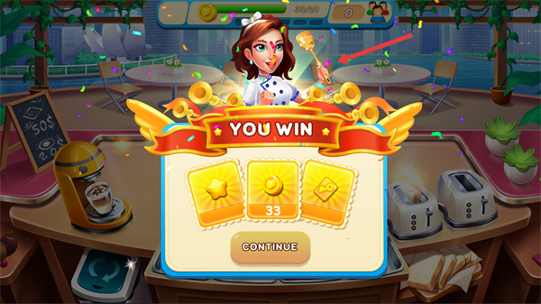 4、成功完成所有烹飪訂單后,會出現YOU WIN的勝利界面,獲得金幣等獎勵,點擊CONTINUE可繼續下一輪游戲。
