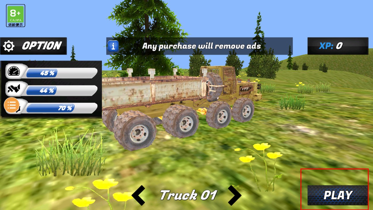 1、在車輛選擇界面,能看到Truck01等車輛,點擊右下角PLAY按鈕,可選擇車輛并進入運輸任務場景。