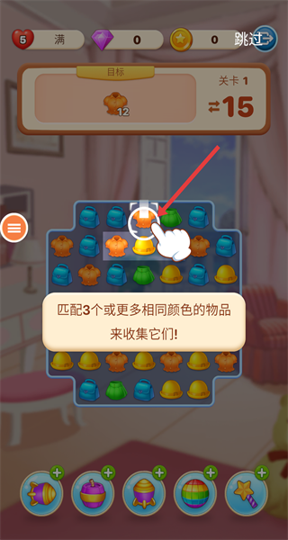 4、關卡內按提示匹配3個及以上同色物品如橙色上衣,聚焦目標衣物快速湊組觸發消除,達成收集數量順利通關。