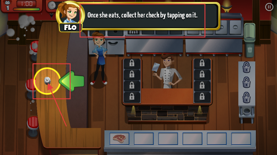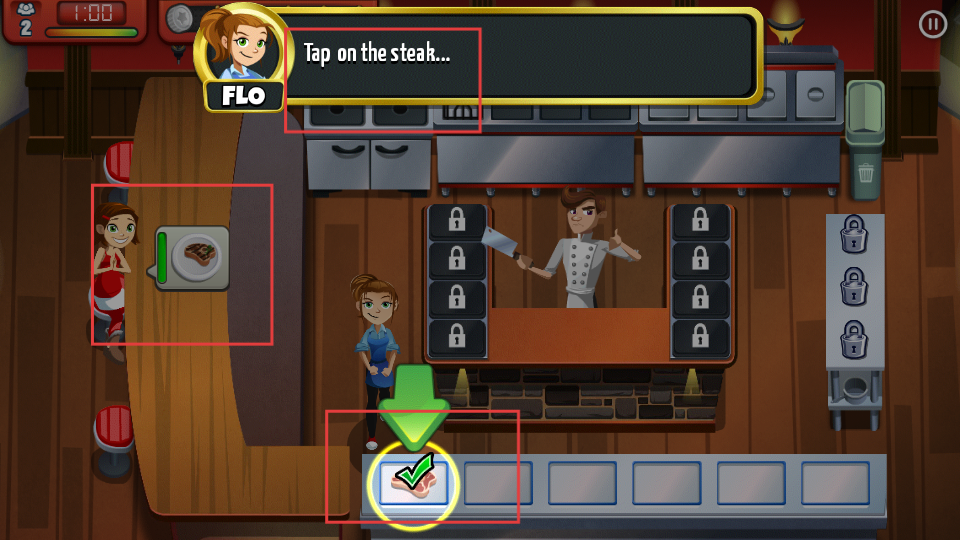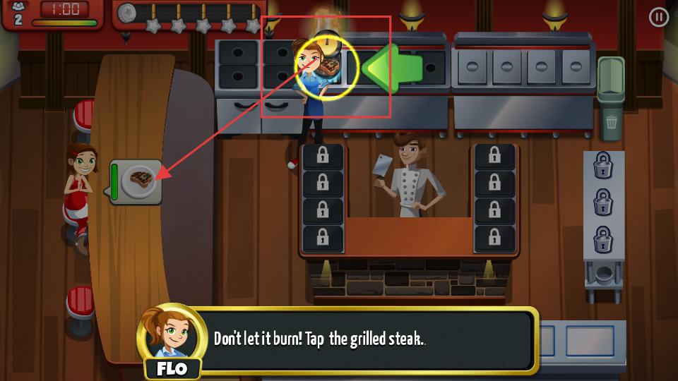 2、烹飪過程中關注食物狀態,像牛排烤制時,別讓它烤焦,及時點擊處理,保證食物能順利提供給顧客。