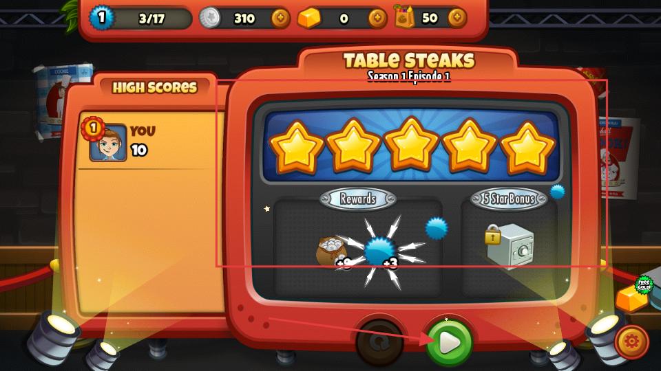 4、完成關卡后,會獲得星星評價和獎勵,可查看高分記錄,然后點擊繼續按鈕,進入下一個關卡繼續經營餐廳。