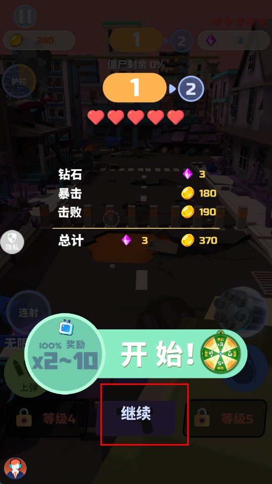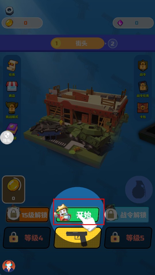 1、點擊【開始】按鈕進入【街頭】關卡,開啟僵尸獵殺戰斗,準備使用武器應對來襲僵尸。