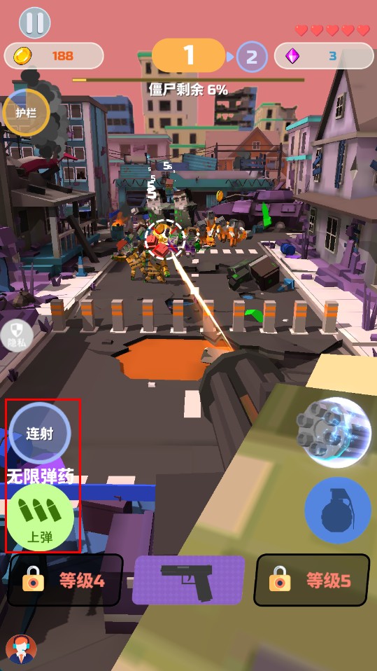 2、瞄準前方僵尸射擊,關注上方僵尸剩余進度,利用槍械攻擊,適時補充愛心道具維持生存。