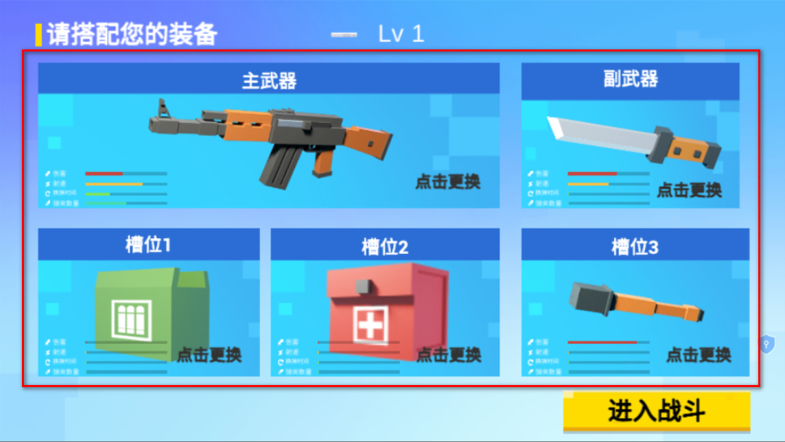 1、進入游戲先搭配裝備,選好主武器、副武器,再給槽位1、槽位2、槽位3配備合適道具,都選好后點擊進入戰斗。