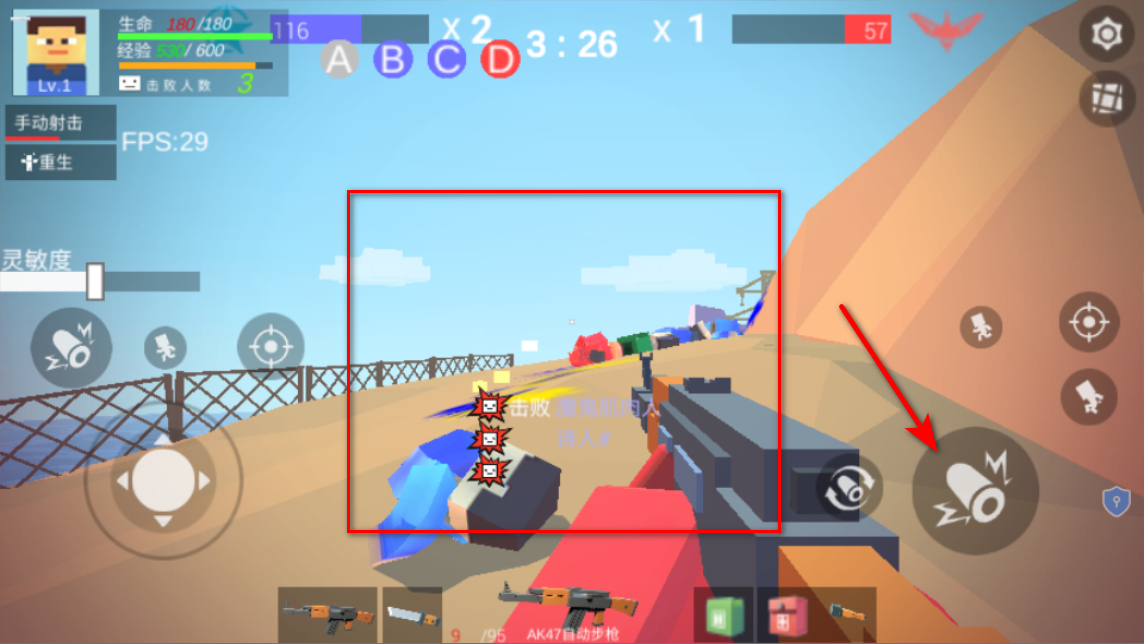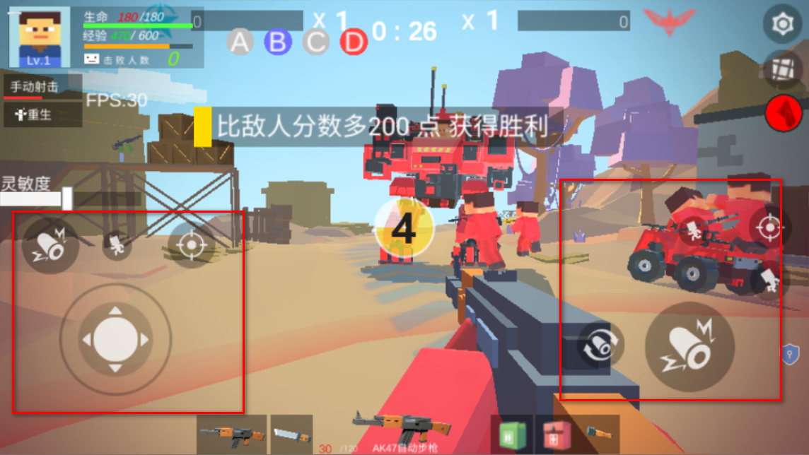 2、戰斗時,用左側搖桿控制移動方向,右側按鈕進行射擊,還有特殊攻擊等操作按鈕,要靈活運用,和敵人展開對抗。