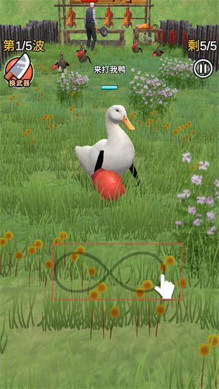 1、在游戲界面中通過手指繪制如無限符號等形狀的軌跡,操控鴨子利用長手按照軌跡進行攻擊,以此來對抗敵人。