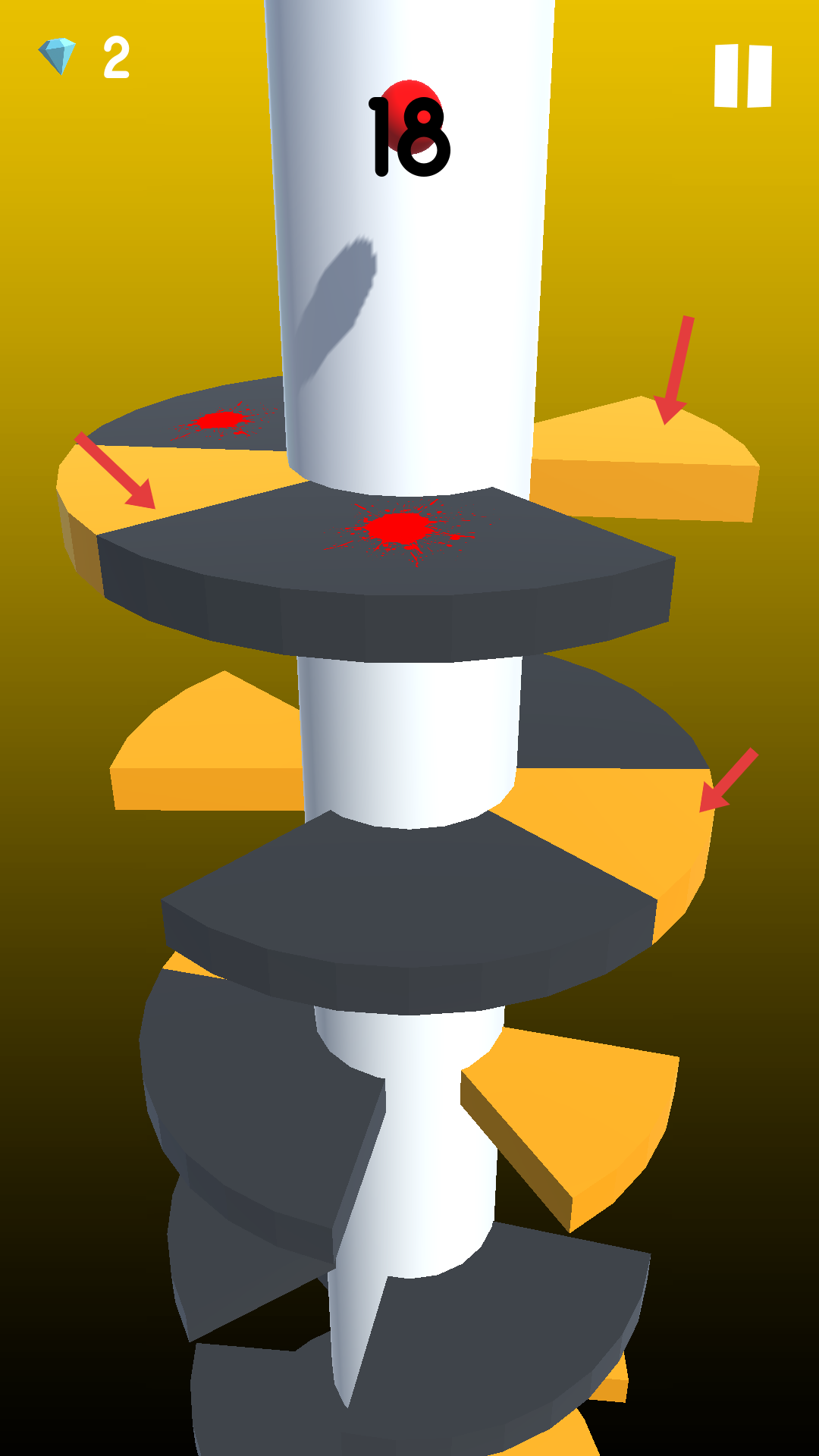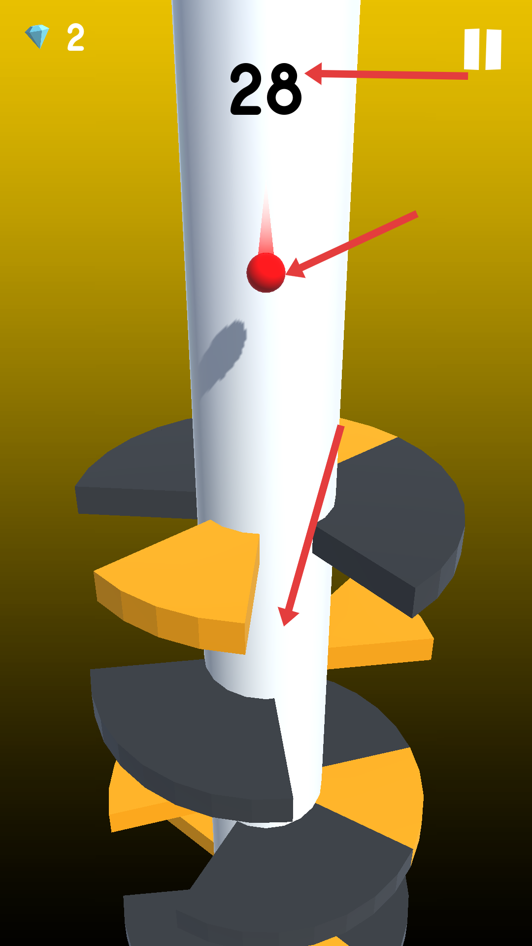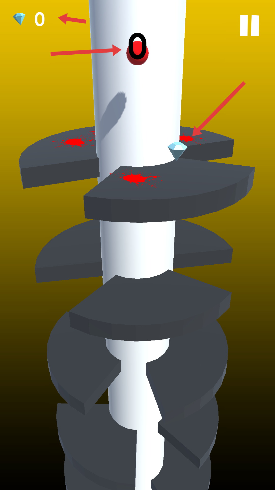4、持續讓小球穿過層層旋轉平臺,躲避平臺的阻礙,同時盡可能收集更多鉆石,就可以獲得更高的分數。