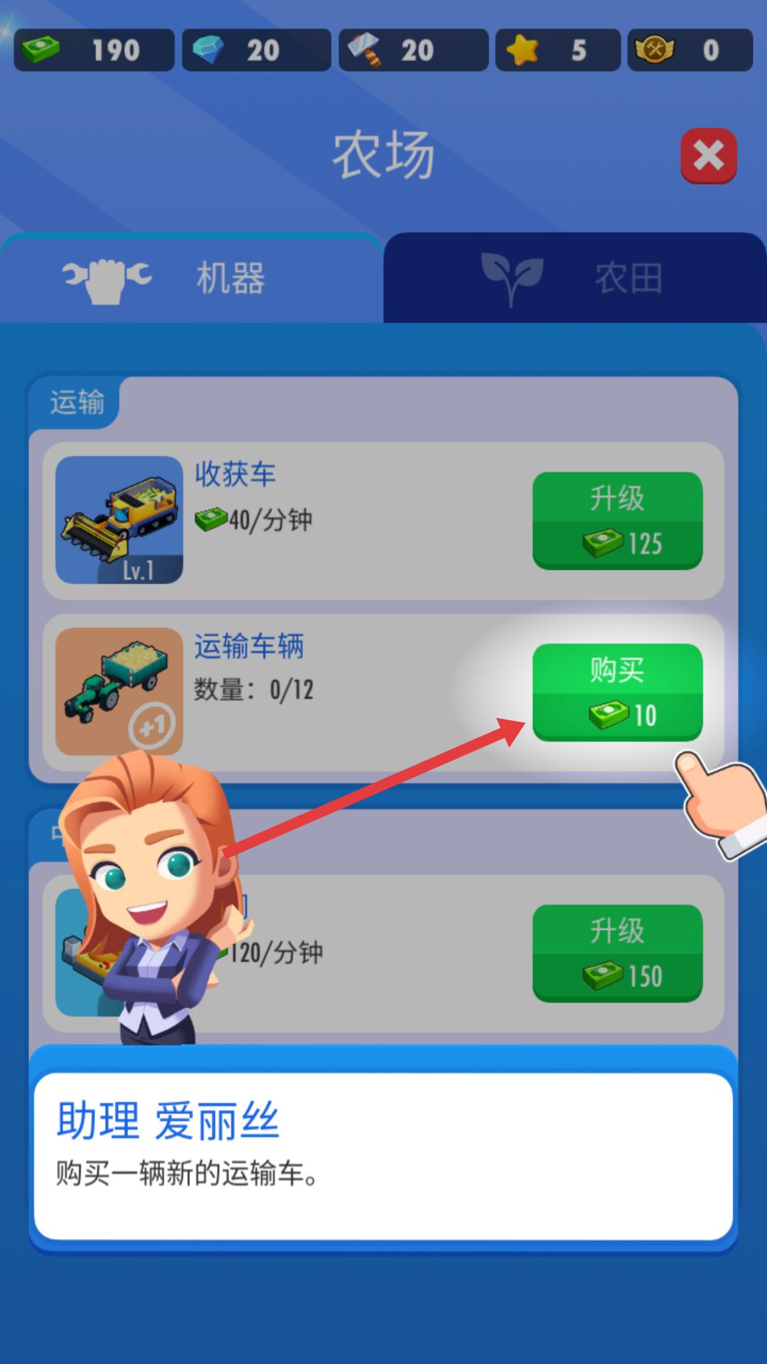 1、根據提示購買運輸車輛,花費相應貨幣解鎖,以便后續運輸農場產出的作物。