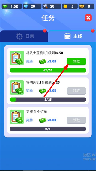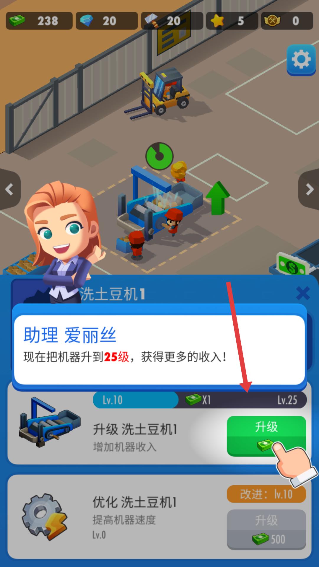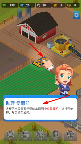 3、關注機器升級提示,消耗貨幣升級洗土豆機等設備,提升機器收入,助力農場發展。