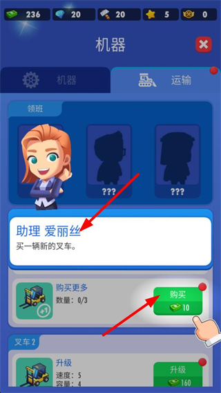 3、進入機器界面,可按照提示購買叉車等設備,點擊購買按鈕獲取新設備,助力農場內的物資運輸等操作。