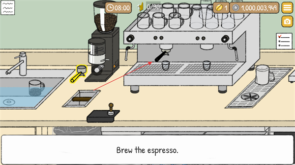 2、游戲中會給出制作咖啡的提示,如Brew the espresso煮濃縮咖啡,按要求依次操作比如先使用咖啡機煮制濃縮咖啡制作完成。