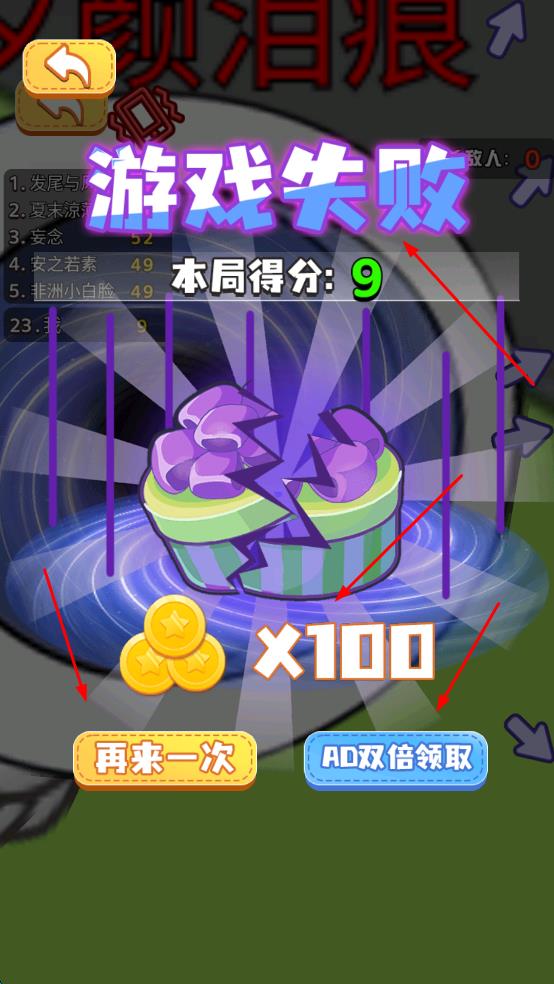 4、游戲失敗后查看得分與金幣獎勵,可選擇再來一次重新挑戰,或觀看廣告獲取雙倍獎勵,積累資源助力實力提升。