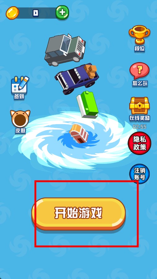 1、進入游戲會看到帶有車輛、寶箱等元素的界面,點擊開始游戲按鈕,即可開啟黑洞吞噬挑戰,進入游戲場景。