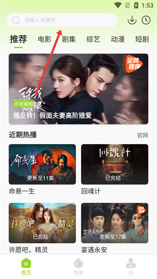 1、點擊應用首頁的搜索框,輸入想要觀看的內容名稱,然后點擊搜索按鈕,等待搜索結果展示出來。