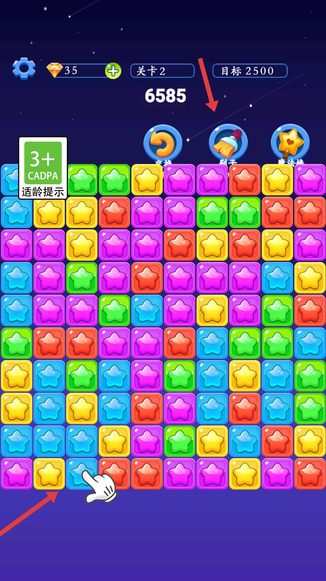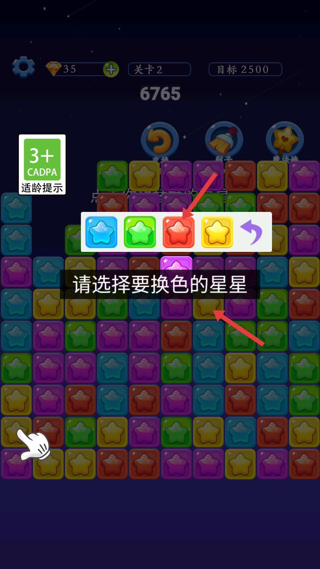 2、消除過程中,會出現換色提示,可選擇要換色的星星,改變星星顏色,助力更多星星消除,獲取更高分數。