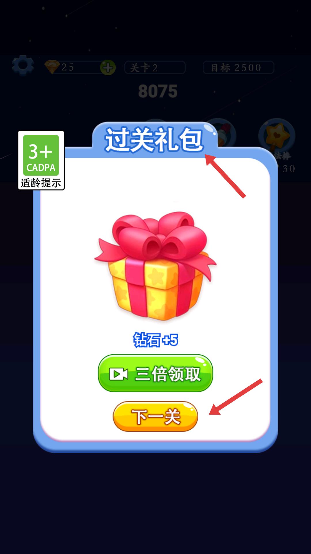 3、成功過關后,會彈出過關禮包界面,能領取鉆石獎勵,也可選擇三倍領取,之后點擊下一關繼續游戲。