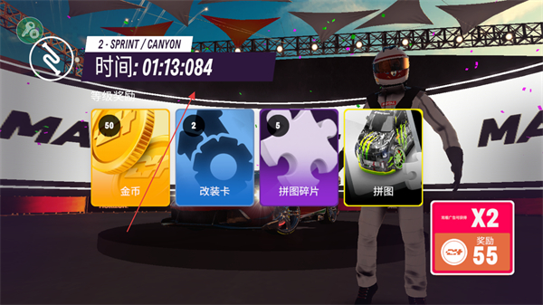 4、完成比賽后,根據比賽名次和表現領取獎勵,如金幣、改裝卡、拼圖碎片等,金幣可以用于購買新車或升級現有車輛的性能。