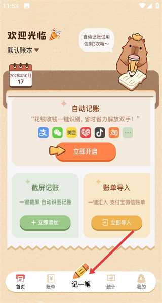 1、進入APP首頁點記一筆可手動錄入消費,有自動記賬等功能,按需選擇手動添加開啟便捷記賬流程。