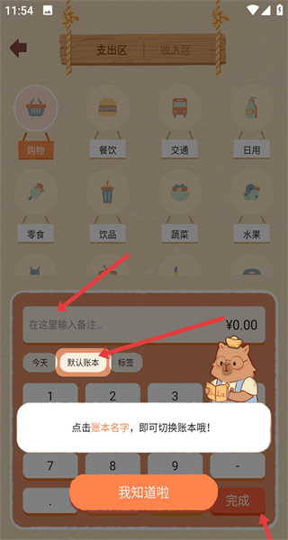 3、用戶選好分類后填備注與消費金額,選擇所歸屬的賬本點完成確認錄入,快速記錄單筆消費完善賬本。