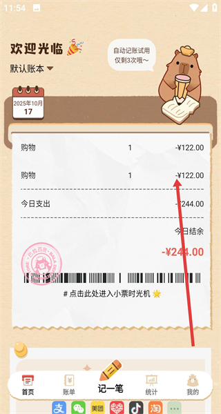 4、記錄后能夠在首頁或賬單頁查看消費明細,精準如購物支出金額掌握每日收支管理個人財務。