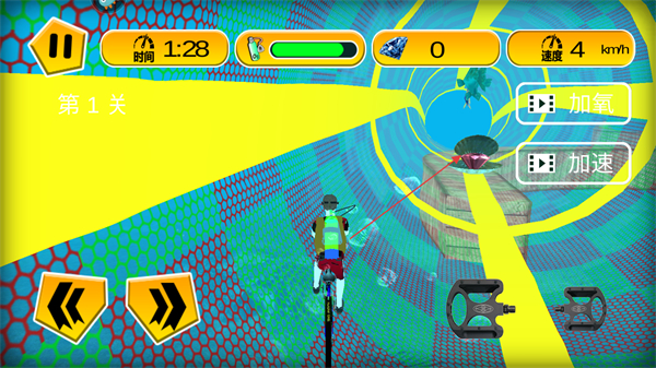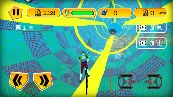 2、利用屏幕左右兩側的方向虛擬按鍵控制自行車的移動方向,讓自行車在復雜的賽道上順利前行,躲避各類障礙物。