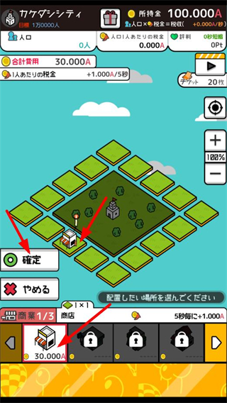 2、選擇商店類建筑,消耗30000A在地圖空地放置該建筑,點擊確定完成建造,建筑會按時間產出稅金,積累城市資源。