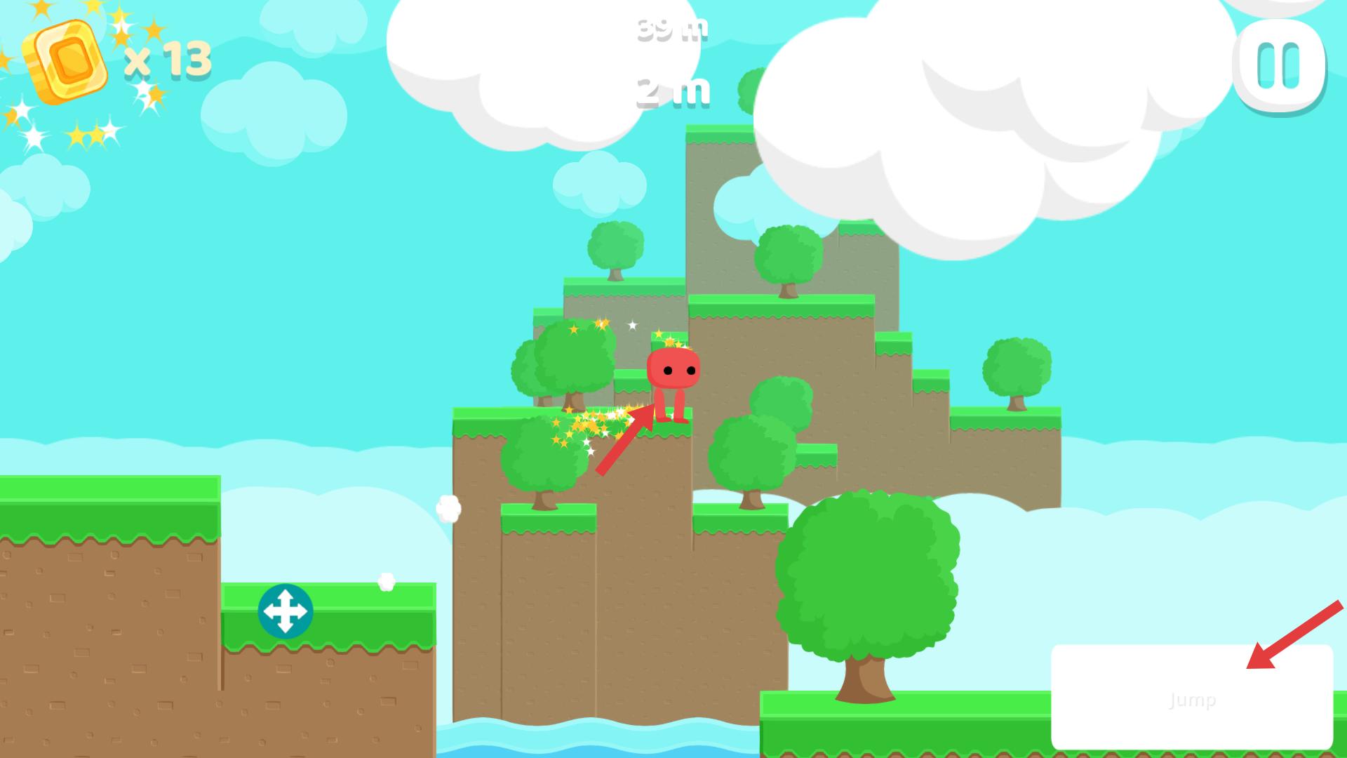 2、操控紅色小人移動,遇到gaps時,點擊Jump按鈕讓小人跳躍,跨越障礙,同時盡量收集金色方塊。