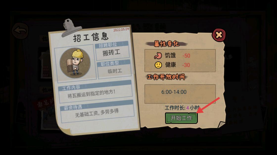 4、查看招工信息,了解搬磚工等職位的工作內容、薪資待遇及屬性變化,點擊開始工作,開啟打工。