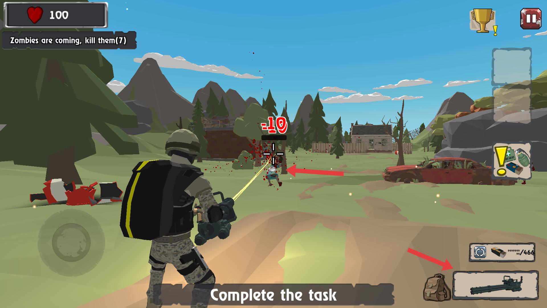 4、進入任務區域后,會遇到僵尸來襲,使用武器攻擊僵尸,屏幕會顯示攻擊造成的傷害數值,完成擊殺僵尸的任務。