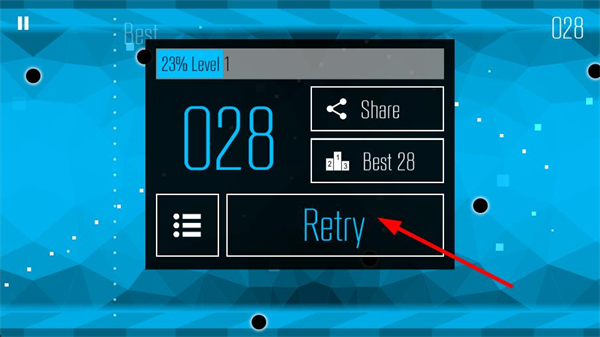 3、若小球被黑洞吸附,會顯示當前得分和最佳記錄,點擊Retry按鈕可重新開始游戲,再次挑戰獲取更高分數。