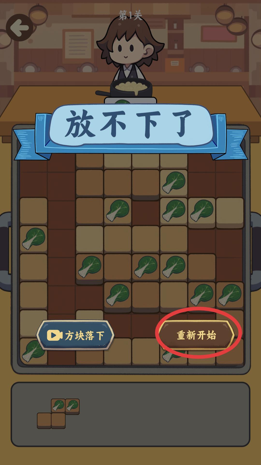 4、若出現放不下了的提示,說明格子空間不足,可點擊重新開始按鈕,重新規劃方塊放置策略。