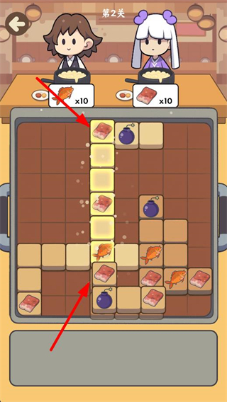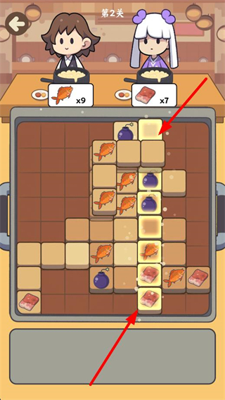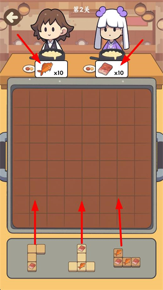 2、第2關需準備魚x10、肉x10等食材,下方有不同形狀的拼圖塊,需將其放置到上方網格里,完成食材拼接。