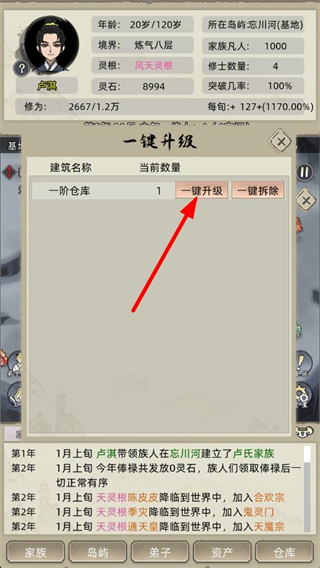 3、點擊一鍵升級,提升建筑的等級,增強建筑的功能和資源產出,提升宗門的整體實力。