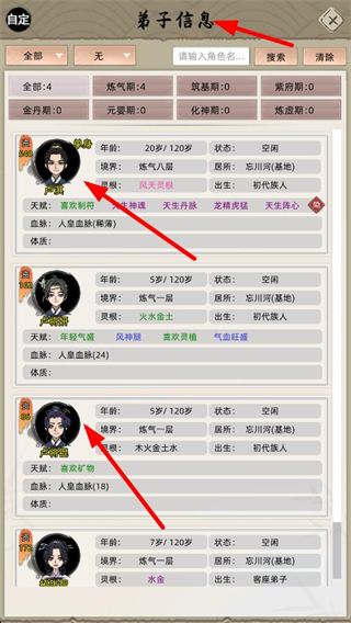 2、查看弟子信息,了解弟子的境界、靈根等屬性,合理分配弟子的工作和修煉,優化弟子的培養效果。