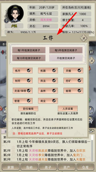 1、進行工作設置,選擇檢測空閑弟子的頻率和弟子的工作類型,如煉丹、煉器等,提升宗門的資源產出和弟子發展。