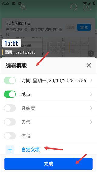 2、在編輯模版界面可開啟或關閉時間、地點等選項,還能添加自定義項設置完成后點擊完成保存模版設置。