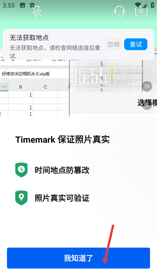 3、若出現無法獲取地點提示可查看相關說明了解Timemark保證照片真實的功能,之后點擊我知道了繼續后續流程。