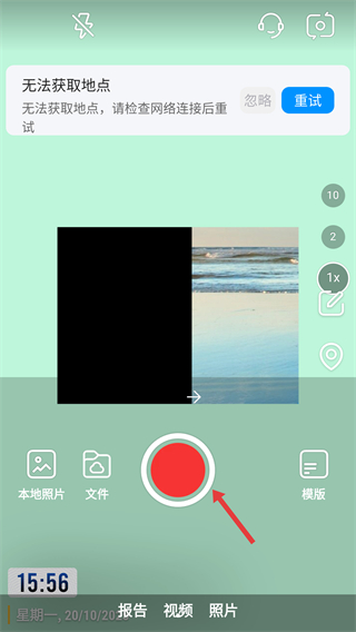 4、進入拍攝界面可選擇本地照片、文件或直接點擊紅色拍攝按鈕進行拍攝,也能使用模版功能滿足不同拍攝需求。