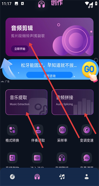 1、打開創作界面依據需求選音頻剪輯可剪片段做鈴聲,點音樂提取分離音頻元素選音頻拼接合并音軌,點擊對應入口開啟創作流程。