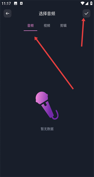 2、進入選擇音頻頁面點擊頂部視頻標簽切換分類,若暫無數據可從本地添加,選好需處理的音頻后點右上角的勾完成選擇進入下一步。