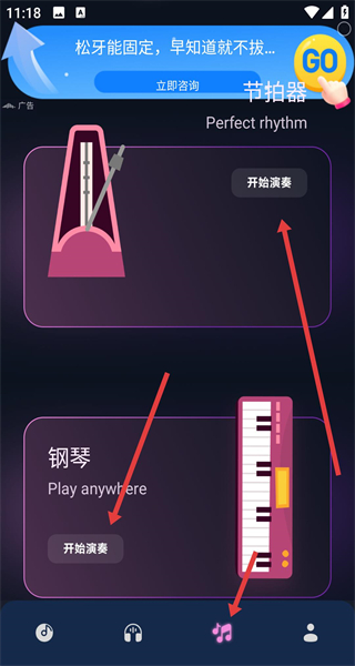 3、在主界面點擊底部音符樣式圖標進入演奏區,按需選節拍器或鋼琴模塊,點模塊右側開始演奏即可跟隨節奏或彈奏鋼琴音。