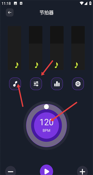 4、進入節拍器界面可點擊上方帶音符的黑色模塊切換節奏類型,通過下方音符圖標更換音色點功能按鈕調整節拍模式,轉動中間BPM旋鈕精準設置節拍速度。