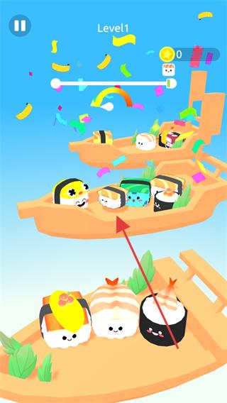 3、操控壽司角色持續前進與其他可愛的壽司形象相遇時,就說明你已經闖關成功了,不斷向關卡目標推進。