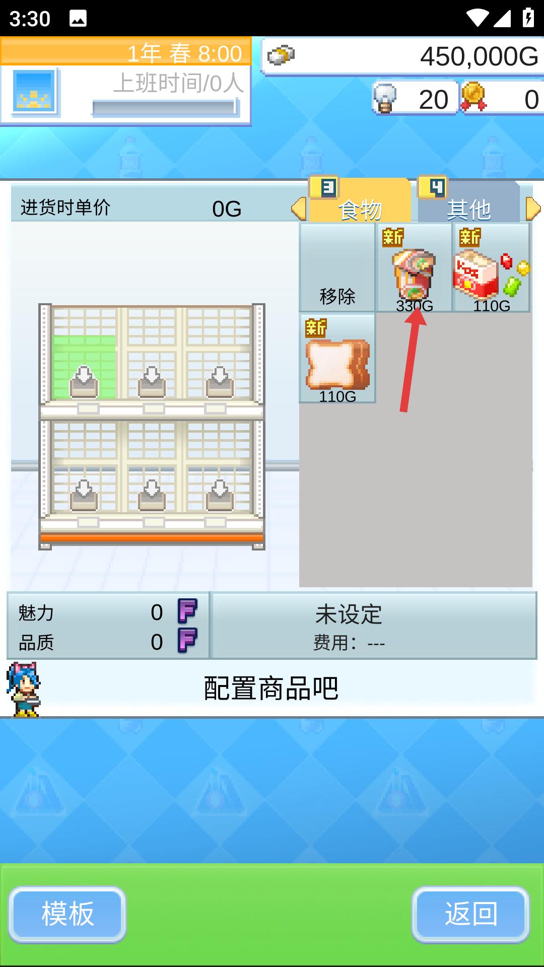 4、在商品配置界面,可選擇食物類商品如泡面等,將其配置到貨架上,為便利店備貨,以便開展經營。