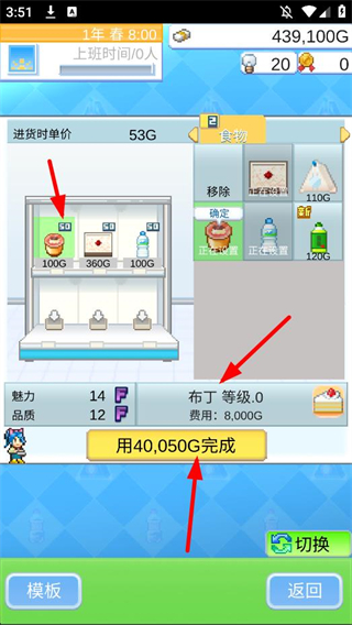 3、進入進貨界面選擇商品如布丁,確認花費金額后點擊完成,將商品上架到冷藏柜等設施里,補充店內貨品。