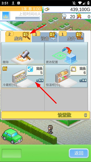 1、在店內設施界面,選擇解鎖的冷藏柜小,準備將其布置到店內,以此豐富便利店的儲物設施配置。