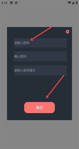 2、在彈出的密碼輸入界面,依次輸入密碼確認密碼和密碼提示,然后點擊確定按鈕。
