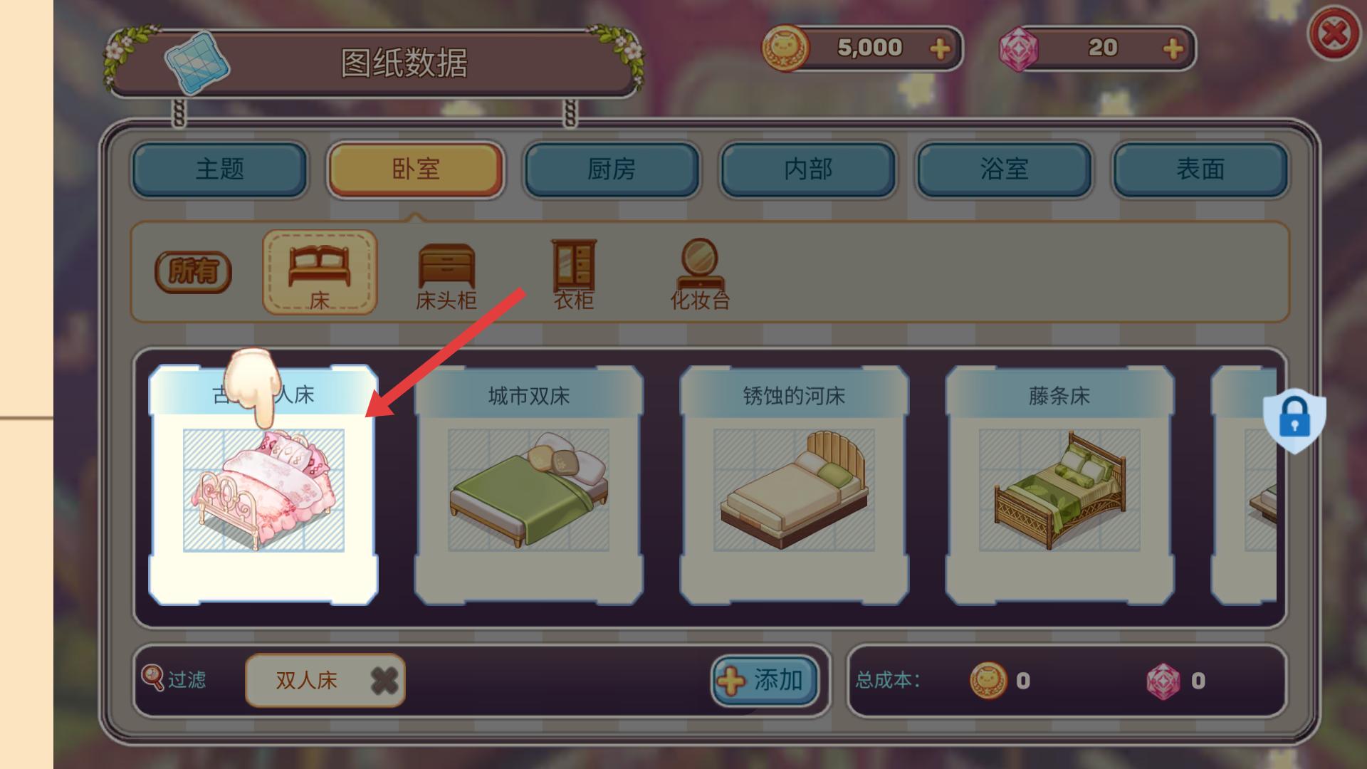 3、在圖紙數據中選擇合適的床具,如古典風格的床,確定家具的樣式和風格。