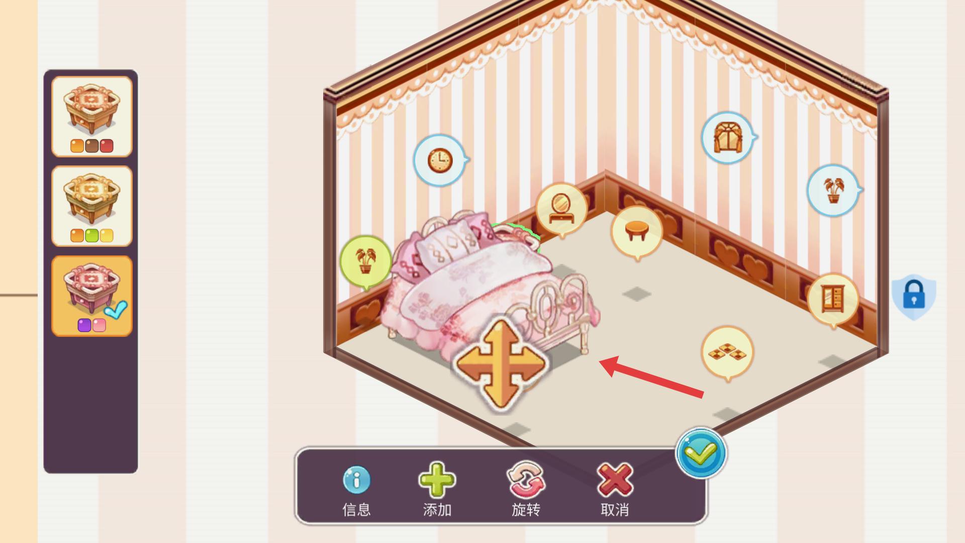 4、將選定的床具放置到臥室場景中,可調整其位置,完成后點擊確認鍵,完成該部分的設計布置。